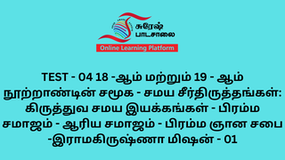 TEST - 03, 18 -ஆம் மற்றும் 19 - ஆம் நூற்றாண்டின் சமூக - சமய சீர்திருத்தங்கள்: கிருத்துவ சமய இயக்கங்கள் - பிரம்ம சமாஜம் - ஆரிய சமாஜம் - பிரம்ம ஞான சபை -இராமகிருஷ்ணா மிஷன் - 02